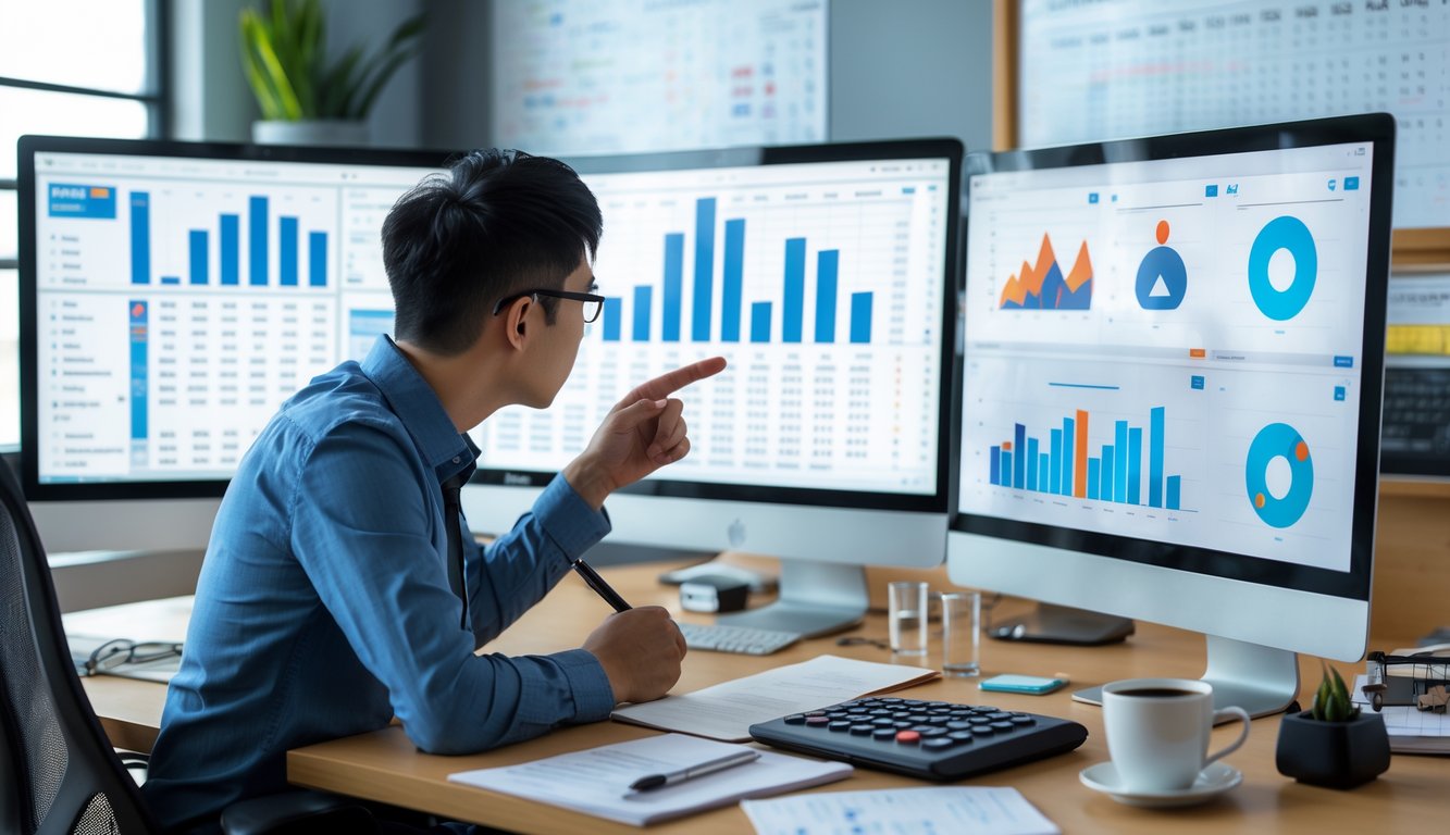 Seseorang di kantor yang fokus menganalisis data angka dan grafik pada layar komputer untuk memprediksi angka hoki.