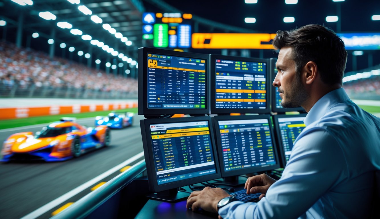 Seorang penjudi profesional sedang menganalisis data taruhan balap mobil di depan layar digital dengan latar belakang mobil balap yang sedang melaju di lintasan.